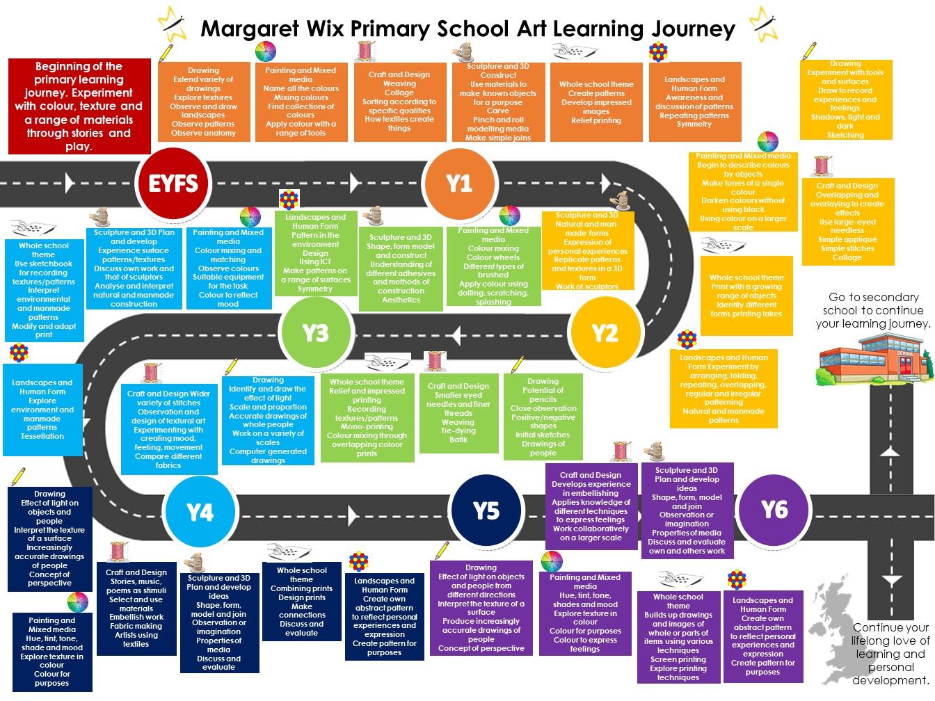 It is demonstrated through the success of our learners and their confidence to demonstrate the knowledge they have retained over time, as well as their readiness for the next stage in education and for life in the wider world. We wish for our children to leave Margaret Wix with the knowledge that Art and Design is simply another language that we can use to articulate ideas and that everyone is capable of creating interesting, individual and exciting pieces of art and design work, no matter what their skill level.