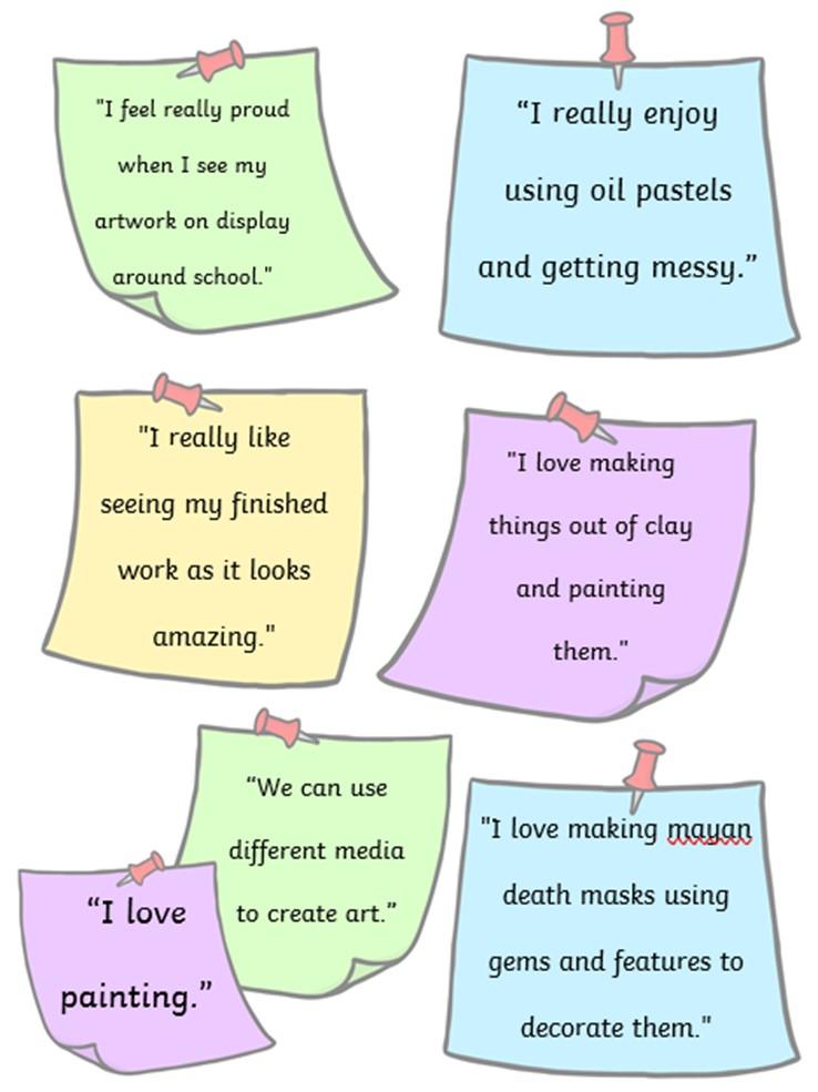 Long-term plans ensure that topics covered in Art and Design are linked as much as possible to those covered in other subjects, particularly in History, Geography and Science, as well as RE and PSHE.