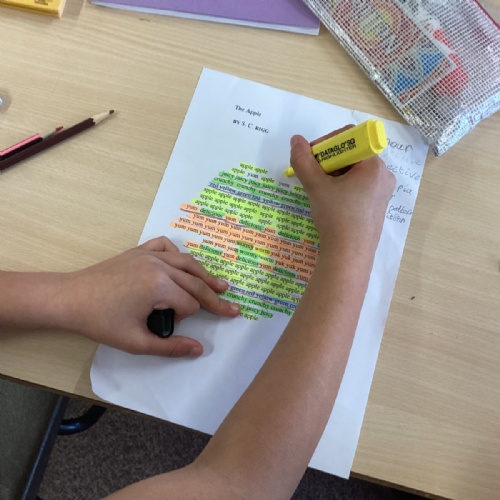 We then looked at a selection of ‘Shape Poems’ (calligrams), where the shape of the poem and the words used represented the themes and concepts which the poems were about. We created our poems about a selection of fruits, before moving on to our own compositions about the streets in which we live, inspired by the poem, Street Music by Arnold Adoff.