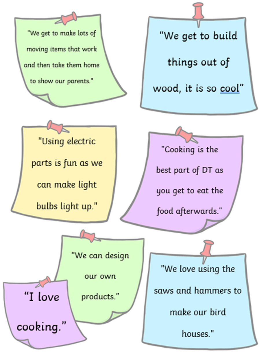 The impact of our curriculum is the measure of how well our intent has been realised. It is demonstrated through the success of our learners and their confidence to demonstrate the knowledge they have retained over time, as well as their readiness for the next stage in education and for life as an adult in the wider world. We wish for our children to leave school with the knowledge that DT is simply another language that we can use to articulate ideas and that everyone is capable of creating interesting and exciting pieces of design work, no matter what their skill level.