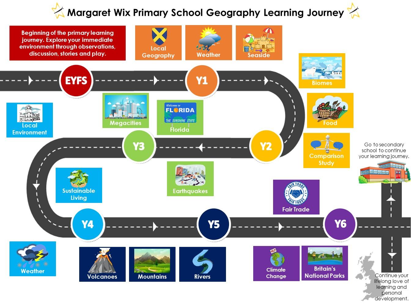 The children at Margaret Wix Primary will have the confidence to demonstrate their knowledge they have retained over time and demonstrate a readiness for the next stage of their learning. They will show a positive attitude to learning and use and apply skills across the curriculum, making meaningful connections in purposeful contexts. Their engagement of the local environment ensures that children learn through first hand experiences of the world around them; they will have an understanding that geography impacts upon our lives daily.
