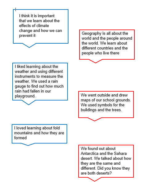 Fieldwork opportunities are provided in geography, such as visits to habitats in the local environment and trips to sites which enrich the learning process for all our pupils. Pupils in KS1 are encouraged to compare their local area with other environments. In KS2, pupils are encouraged to express views on real issues, and frequent discussions allow the opportunity to express themselves through challenging and engaging questioning.