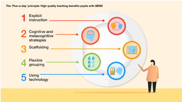 We implement the 'five-a-day' strategy from the EEF within the teaching of geography in variety of ways. The five strategies identified as having strong evidence for their effectiveness in supporting pupils with SEND which we use to underpin The Wix Way: