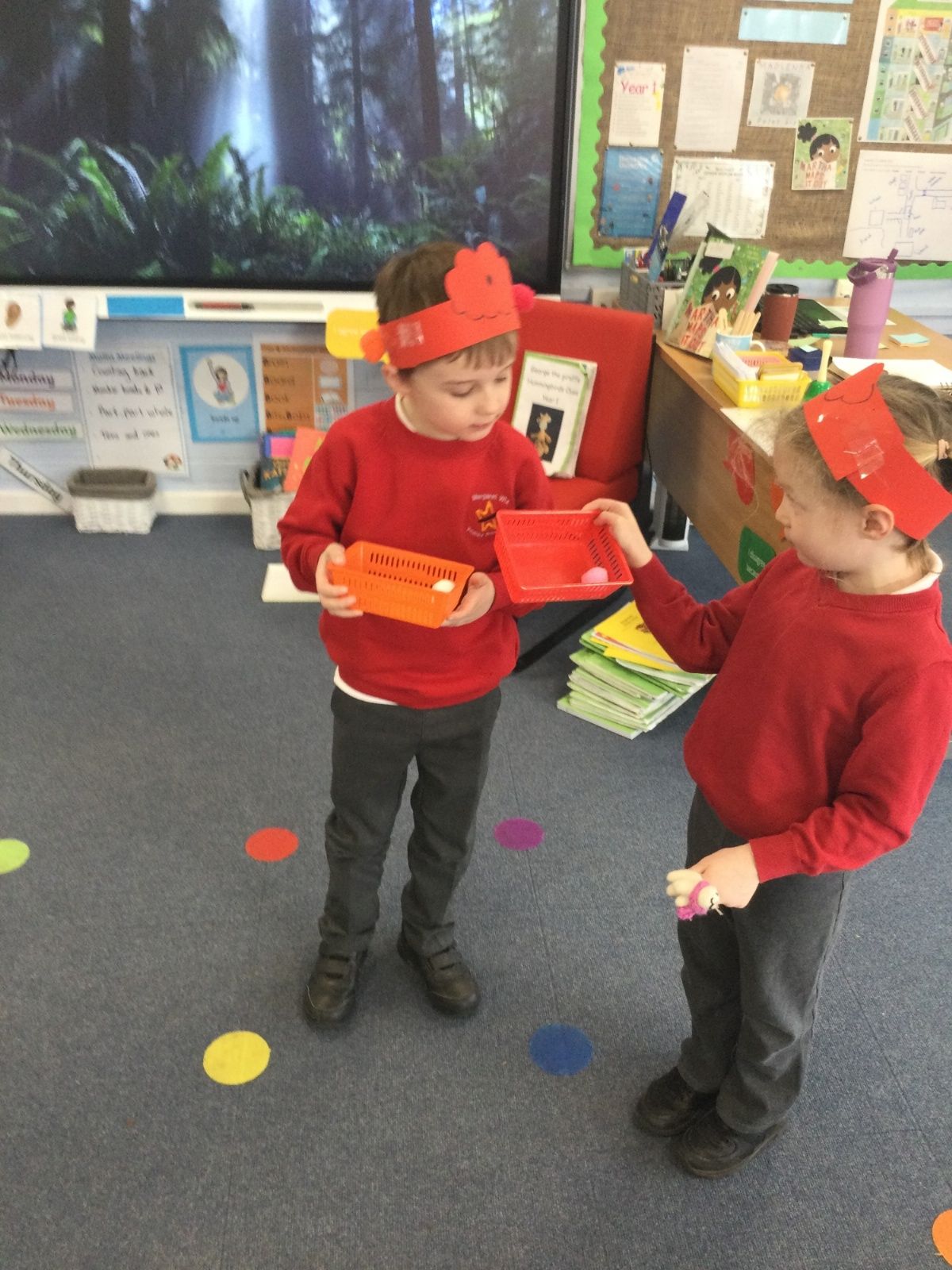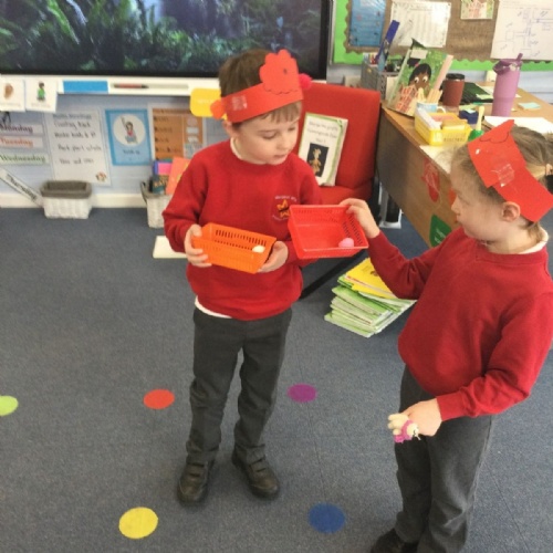 Using numbers up to 20 we reminded ourselves how we can make values in different ways, using lots of different objects and maths equipment. We thought about different ways of making the same value, eg: 8 + 2 = 10 and 4 +6 = 10 and used the balance scales to show this. We have ended the term looking at measures, both standard and non-standard. We have looked at the capacity of different containers and compared them using key words like volume, capacity, full and empty.