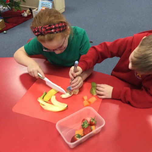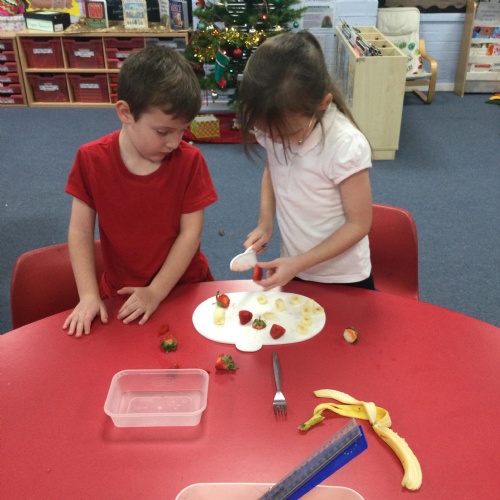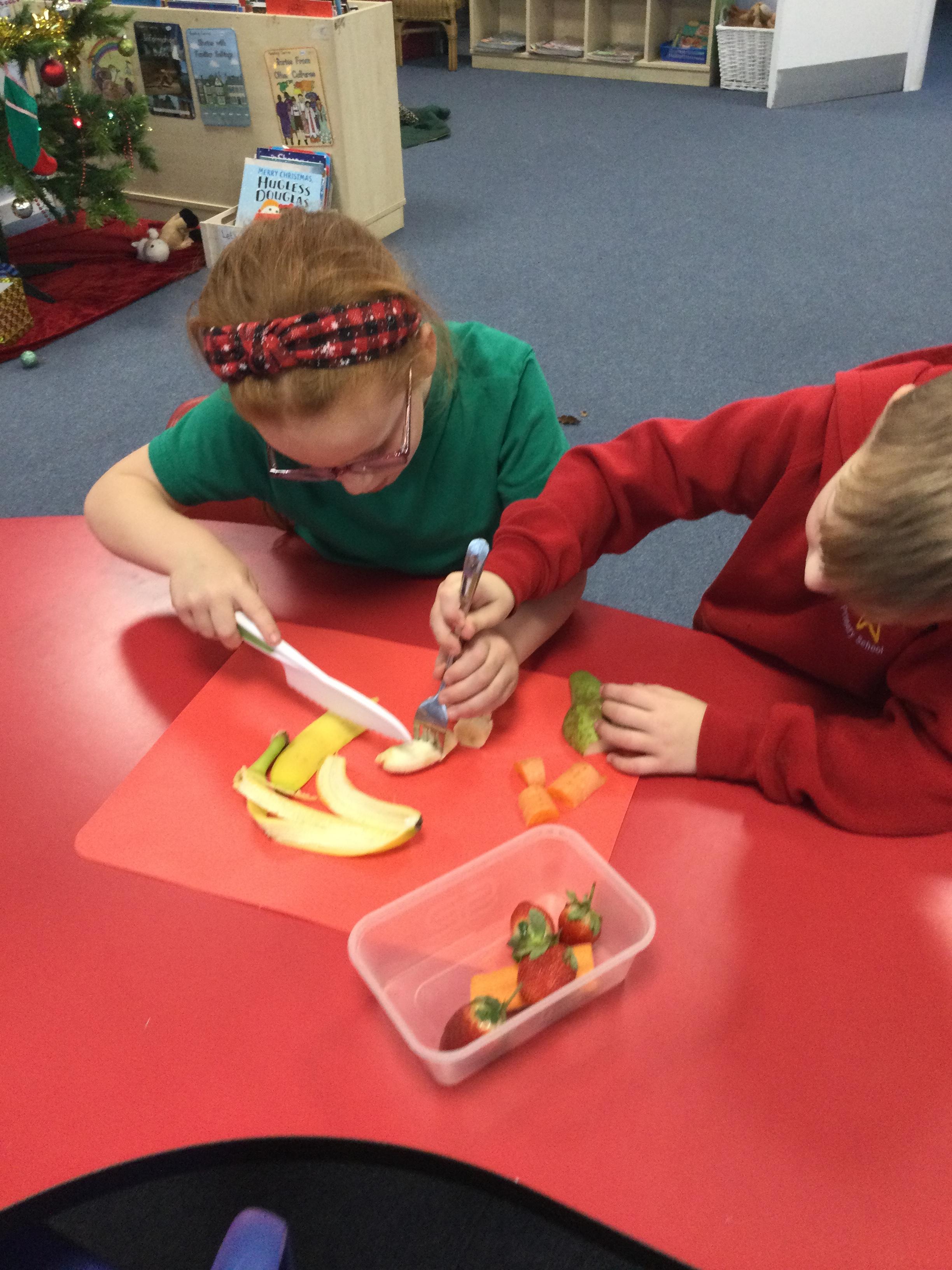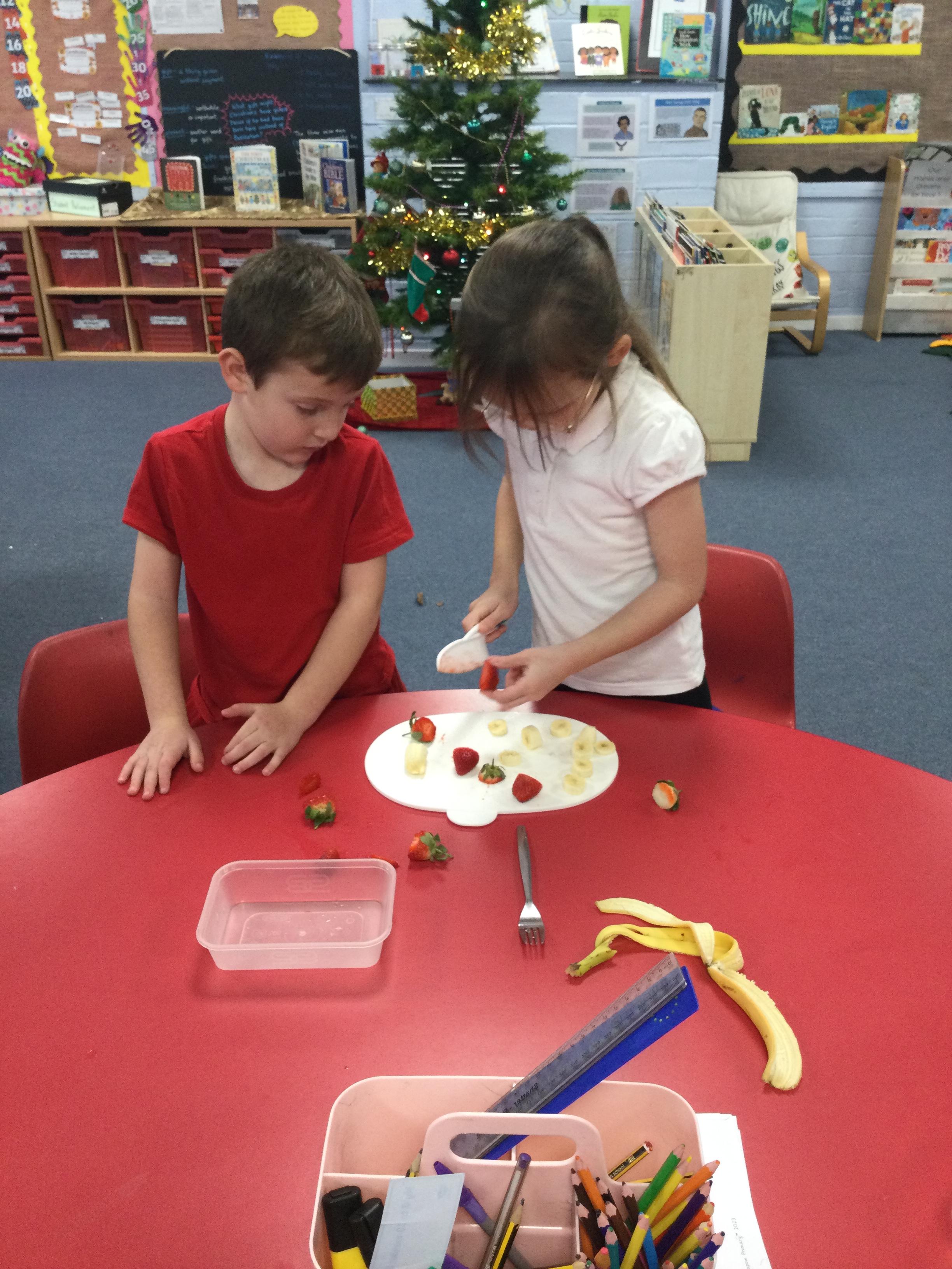In English, we started this half-term by reading ‘Gruffalo Crumble’, a recipe book based on the story by Julia Donaldson. We identified the different features of an instruction text, including bossy verbs. We made our own meals for the Gruffalo with natural objects, such as pine cones, leaves and stones. We also followed a recipe from the book and enjoyed making ‘terrible tusks’ (fruit kebabs). We finished the unit by writing our own instructions for making our own mud pie for the gruffalo, trying hard to include a title, list of ingredients, bossy verbs and sequencing words.