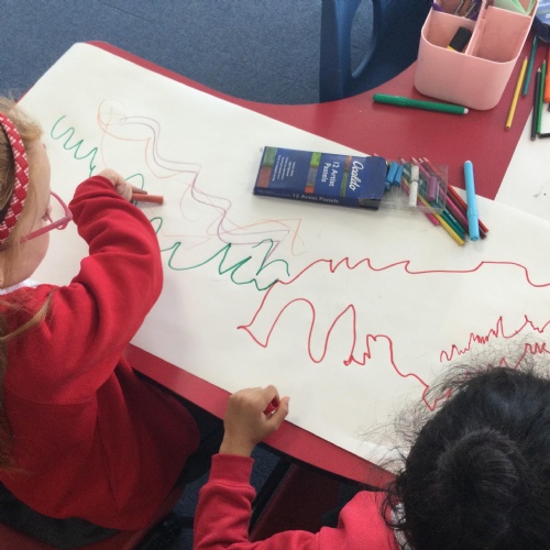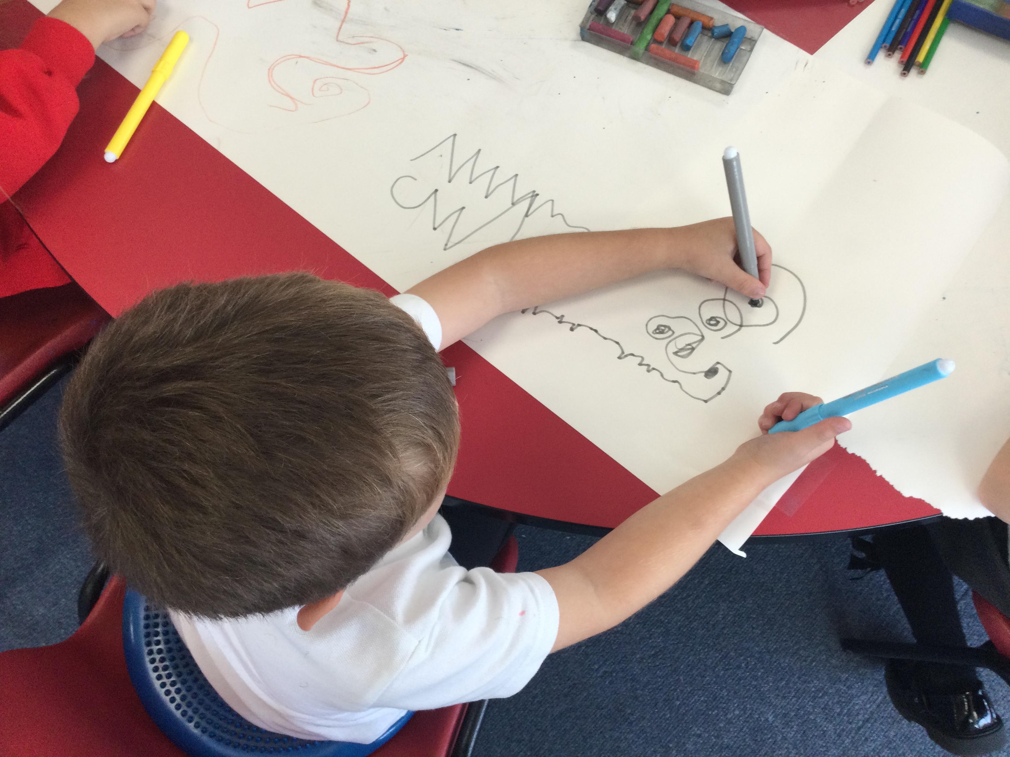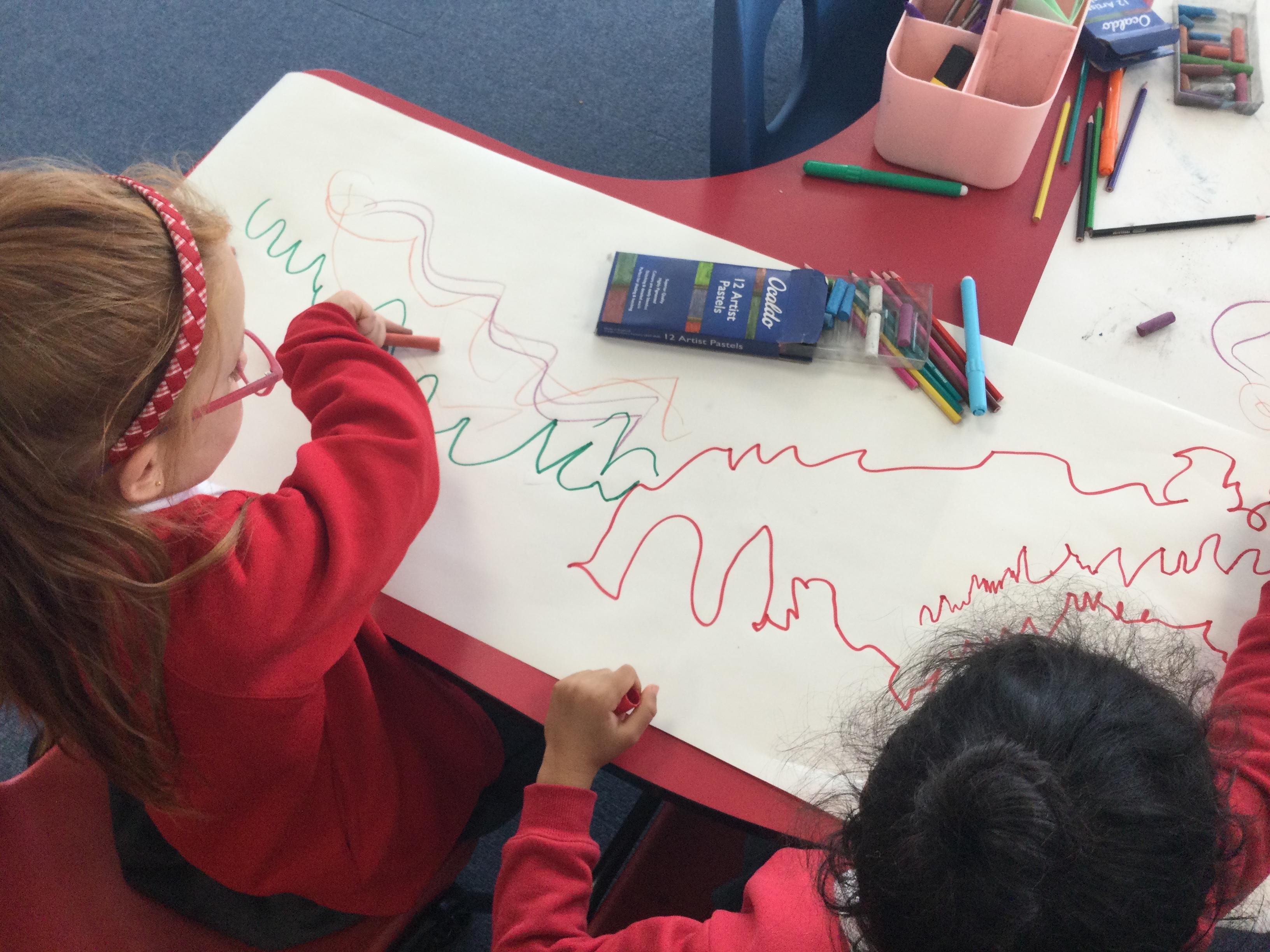 In art, we have been focusing on using different lines in drawing. We first developed our knowledge of the different types of lines we could use such as horizontal, vertical, wavy and broken lines. We then used our knowledge of these different lines to first draw our own individual tiles which we then put together to make a class mosaic. Then we created an underwater picture depicting the waves of the water using wavy lines. Finally we put our observation skills to the test to create some still life pictures of natural objects like shells, leaves and conkers.