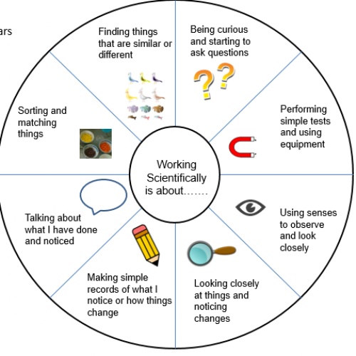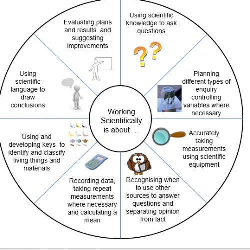 Children learn methods of scientific enquiry and how to ask questions to find out specific information. They are taught to use scientific vocabulary accurately and gain knowledge and skills not just in the classroom, but also through educational visits and reading. Children use the Key Stage one and two scientific wheels to decide what scientific skills they are using during each lesson.
